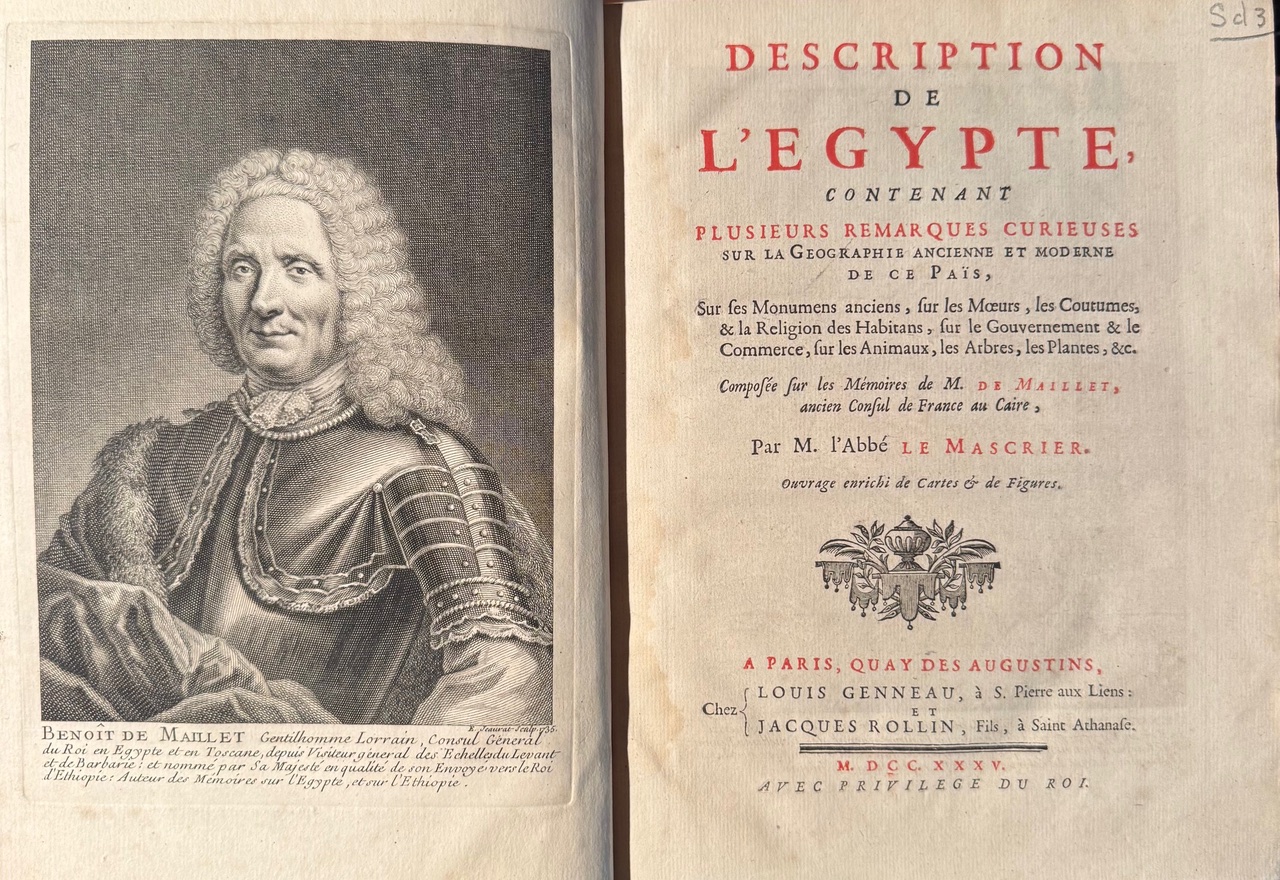 | MAILLET B. de, MASCRIER J.-B. (Ed.) Description de l'Egypte. Contenant plusieurs remarques curieuses sur la Géographie ancienne et moderne de ce Païs, sur ses Monumens anciens, sur les Moeurs, les Coutumes, & la Religion des Habitans, sur le Gouvernement & le Commerce, sur les Animaux, les Arbres, les Plantes, etc. Composée sur les mémoires de M. de Maillet, ancien consul de France au Caire, par M. l'Abbé Le Mascrier. 2 volumes, portrait-frontispiece, XXI pages, (1) page et (1) f. de table des lettres, 328 pages, 242 pages, (5) ff. de table des matières, errata, approbation et privilège, (1) f. blanc. Complet avec portrait gravée en frontispice, carte pliée, 7 planches (dont 5 pliées). Index. PARIS 1735 Réf : 12519 Prix : 2000.00 € Commander |